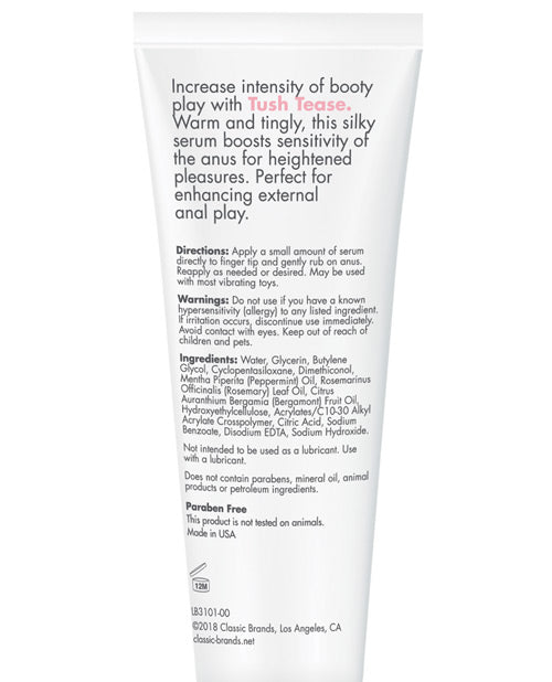 Increase intensity of booty play with Tush Tease. Warm and tingly, this silky serum boosts sensitivity of the anus for heightened pleasures. Perfect for enhancing external anal play. Apply a small amount of serum directly to finger tip and gently rub on anus. Reapply as needed or desired. May be used with most vibrating toys. Warming and tingly serum, ideal for enhancing anal play. Formulated to boost sensitivity and heighten pleasure. Fragrance Free. Ideal for toy, self and couple's play. This product does not contain parabens or mineral oil. This product is not tested on animals. This product does not contain benzocaine. Made in the USA.
