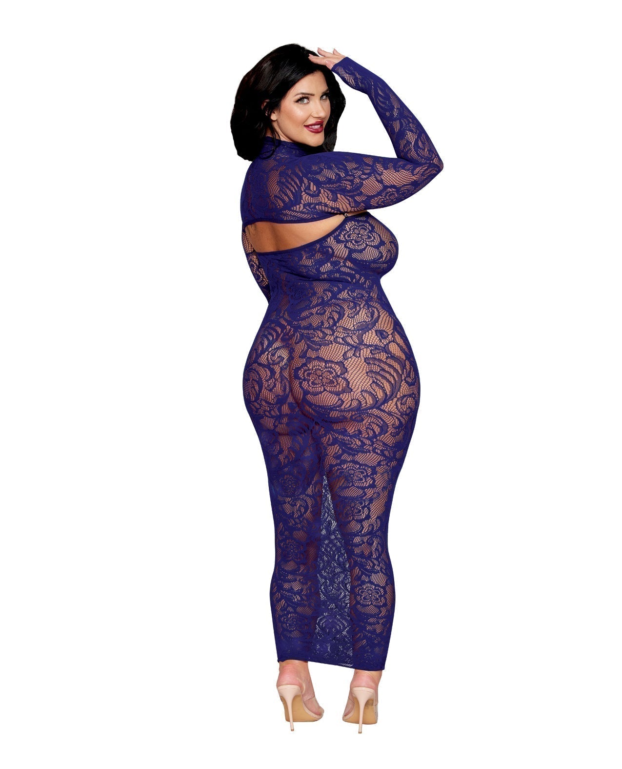 Seamless bodystocking gown and matching shrug set with floral pattern design. Removeable mock turtleneck long sleeve shrug with rhinestone button enclosures.