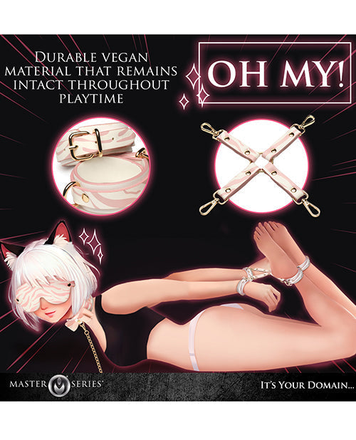 The perfect tiger kitty kit to make you go ""UWU""! Dress up yourself or your partner in bondage that really makes a statement. This unique rose pink, soft peach and white set is made out of vegan friendly leather and held together with beautiful gold plated metal rivets. Included in the kit are pairs of wrist and ankle cuffs, a kitty collar with a bow, faux leather blindfold, a 4 strap hogtie to hold wrists and ankles together, and an adorable kitten-paw paddle! The leather is white with a rose pink tiger stripe print all over it. Each of the cuffs are adjustable for comfort and have D-rings for the hogtie or other bondage gear to attach to. The long, golden chain connects to the cute kitty collar and has a leather handle. The paddle is shaped like a cat head but has a plush, padded side with a large cat's paw print on it that is cushioned and feels thuddy and a flat side that offers a more stingy feeling. All metal is nickel-free for sensitive skin. Spot clean vegan leather as needed by spraying with toy cleaner and wiping dry with a soft cloth.