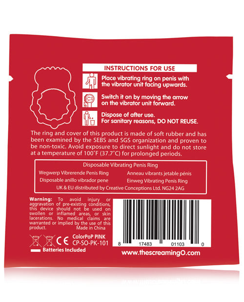 The Screaming O Vibrating Ring is the award-winning sex secret that helps couples have better, more satisfying sex! With pleasure knobs for him and ticklers for her, couples enjoy mutual stimulation with vibration that buzzes throughout the entire ring. Now available as a convenient ColorPoP Quickie, couples can enjoy vibrant vibration at home or on the go with a disposable design they can take anywhere!