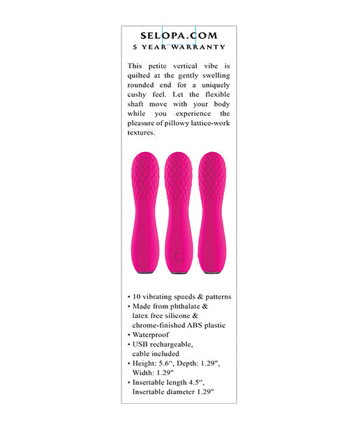 This petite vertical vibe is quilted at the gently swelling rounded end for a uniquely cushy feel. Let the flexible shaft move with your body while you experience the pleasure of pillowy lattice-work textures.