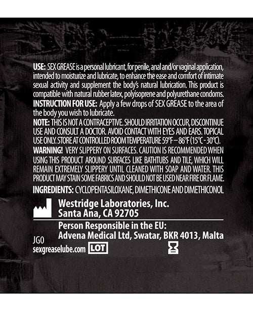Sex Grease Premium Silicone Lubricant. Ultra-long lasting formula. Light and Smooth Feeling Lubricant. Condom Friendly. Water Proof. Clear, Odorless Formula.