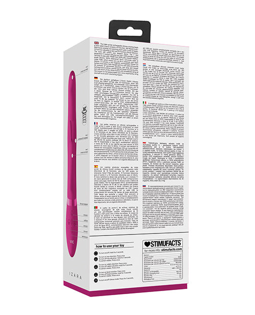 The IZARA, triple-action, beaded G-spot rabbit vibrator, has a 10 function, 360 degree multi directional rotating, non-jamming shaft, packed with 5 rows of beads. It also boasts a 10 function vibrating G-spot and 10 function clitoral vibrators.The IZARA most certainly packs a passionate punch. The 3 motors will give you over 1,000 possible unique settings to play with. Made from 100% silky smooth, medical grade silicone, it's 100% waterproof (ipx7), and extremely quiet at under 60db, which means you can use it wherever your heart desires.