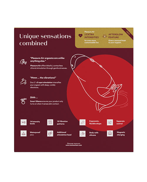 DUO 2 is a unique premium rabbit toy - a Pleasure Air clitoral stimulator and powerful G-Spot vibrator combined to create advanced, blended orgasms. Pleasure Air surrounds the clitoris with pulsating waves and gentle suction leading to a new kind of extraordinary orgasm. Dual Stimulation - DUO 2 simultaneously targets the G-spot with deep rumbly vibrations and the clitoris with suction-like Pleasure Air stimulation, creating satisfying blended orgasms. The flexible inner arm is curved upwards to target the G-spot with gentle vibrations.