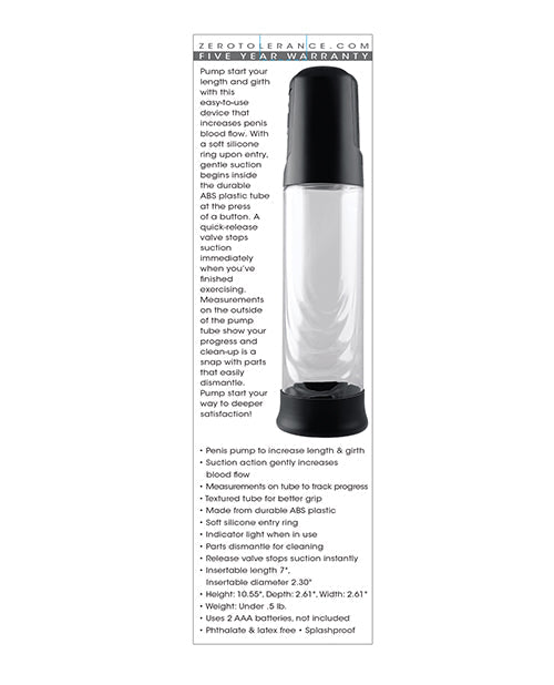 Pump start your length and girth with this easy-to-use device that increases penis blood flow. With a soft silicone ring upon entry, gentle suction begins inside the durable ABS plastic tube at the press of a button. A quick-release valve stops suction immediately when you've finished exercising. Measurements on the outside of the pump tube show your progress and clean-up is a snap with parts that easily dismantle. Pump start your way to deeper satisfaction! Five Year Warranty.